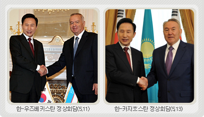 이명박 대통령은 지난 5월 10일부터 14일까지 4박5일 일정으로 우즈베키스탄과 카자흐스탄을 각각 국빈 방문하였습니다. 중앙아는 러시아, 중남미, 아프리카 등 우리의 에너지자원 외교의 4대 전략지역중 하나로서 이번 순방을 통해 에너지자원 외교를 강화하는 중요한 전기가 마련되었습니다.